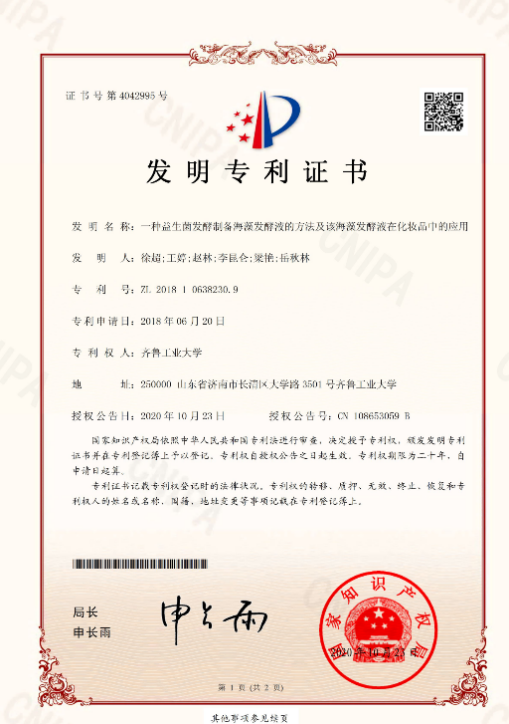益生菌發酵褐藻:璦爾博士國內首創通過“雙菌株(益生菌)雙重發酵技術”,獲得“益生菌發酵褐藻”,褐藻中活性成分通過雙菌雙重發酵技術(將暹羅芽孢桿菌和植物乳桿菌進行雙重發酵)產生更多有效成分,具有平衡微生態、抗氧化、修護、緊致等功效,相關研究成果已被國際化妝品化學家學會聯盟(IFSCC)收錄,并獲得國家發明專利授權。