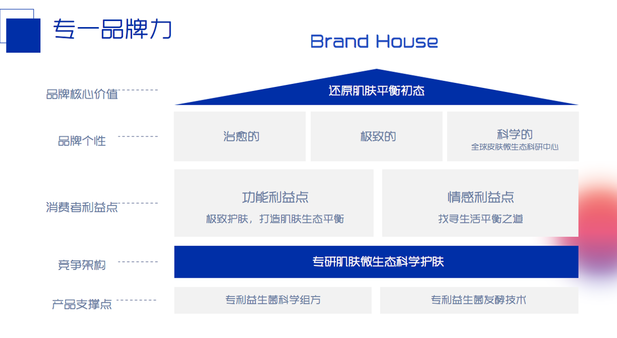 李婷提出璦爾博士產品開發思路歸結為八個字:品牌在左、研發在右。如何讓品牌的所有要素都有一條主線貫穿,所有的事都是一件事,那就是構建品牌的“上層建筑”,所有產品開發都圍繞著品牌屋進行。璦爾博士以專研微生態科學護膚為定位,以專利益生菌科學組方和專利益生菌發酵技術為產品支撐,以品牌屋作為產品開發的骨架,讓品牌能夠始終以統一的聲音講述一件事。
